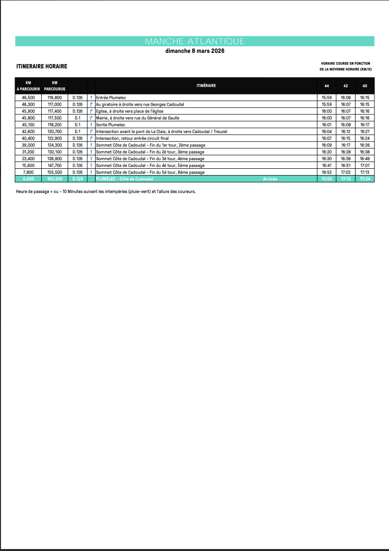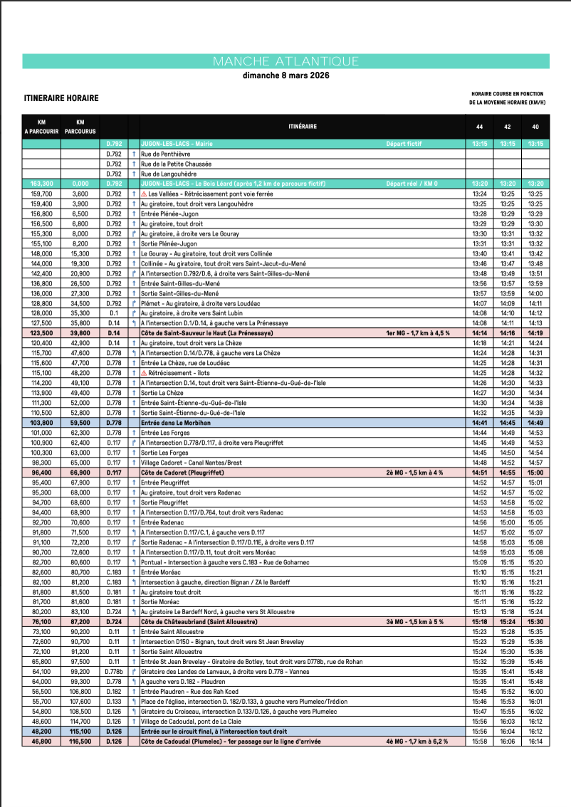 Les horaires de passage sont essentiels pour ne rien manquer de la course. Découvrez l’itinéraire complet et les temps de passage aux points stratégiques du parcours, du départ à l’arrivée.